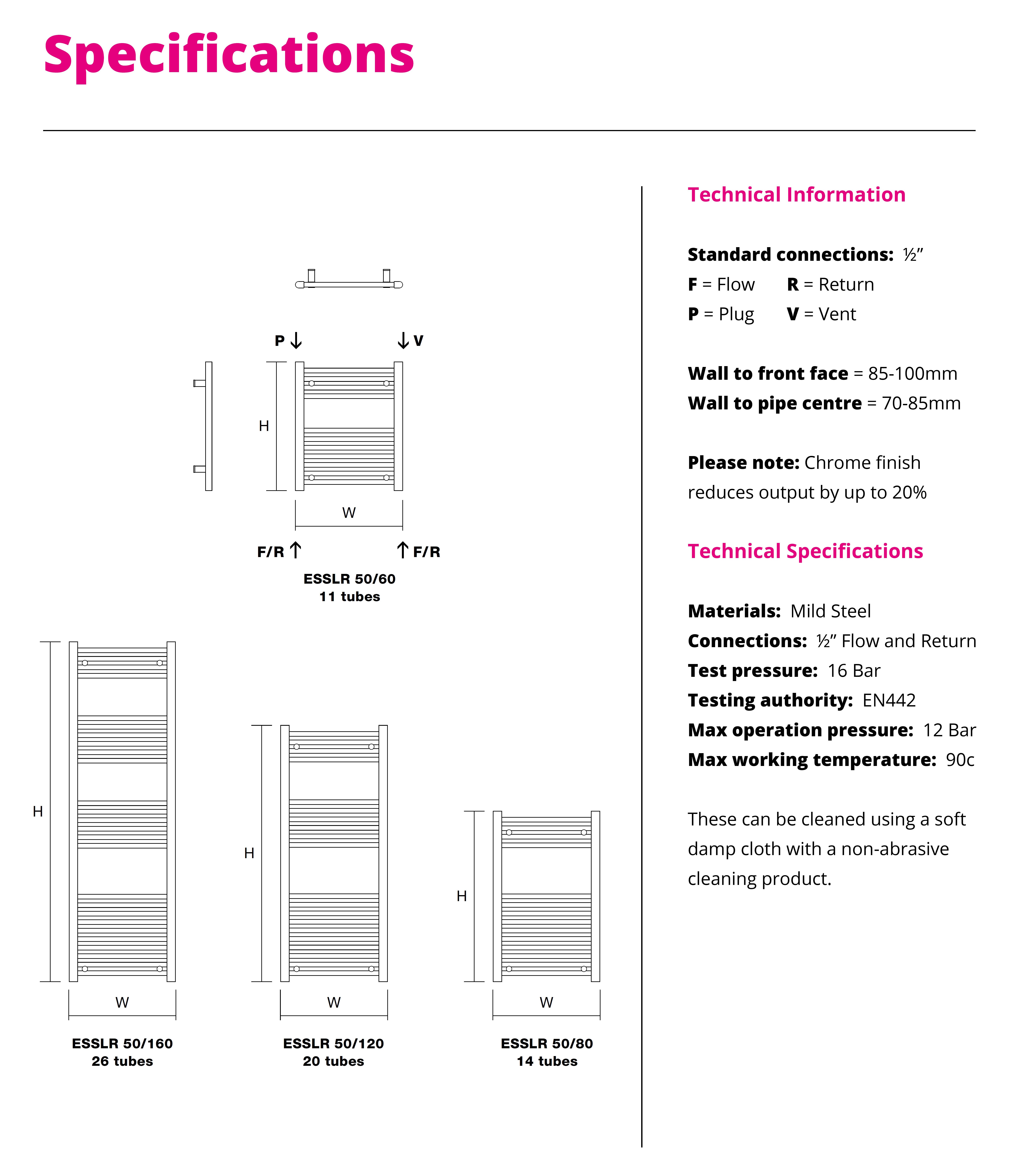 The Essential towel rail is a practical ladder design with large gaps for ease of towel hanging and sleek 22mm cross tubes. It is available in a range of special finishes which add a touch of class to this bathroom favourite. It also comes with a 5 year guarantee.